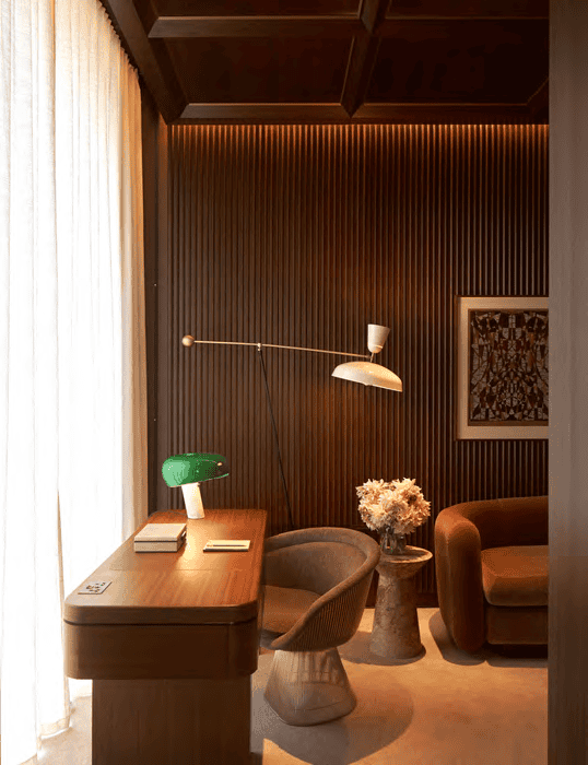 Each suite is designed by Joseph Dirand and reflects a timeless elegance. A warm palette of finishes is used, reminiscent of the original internal architecture. The interiors are bathed in soothing colours and opulent finishes. These include wood and velvet, complimented with green, purple and cream colours. The soft, sandy tones and warm, welcoming colours are reflected, as daylight fades, with warm colour temperatures. Colour rendering throughout the hotel is CRI >90.