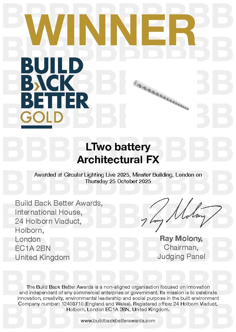 The system offers a versatile circular approach and is as easy to change as a new lamp. LTwo® battery also complies with SLL TM66. Fixtures can be reused and repurposed according to the design requirements. And no additional installation costs or disruption.